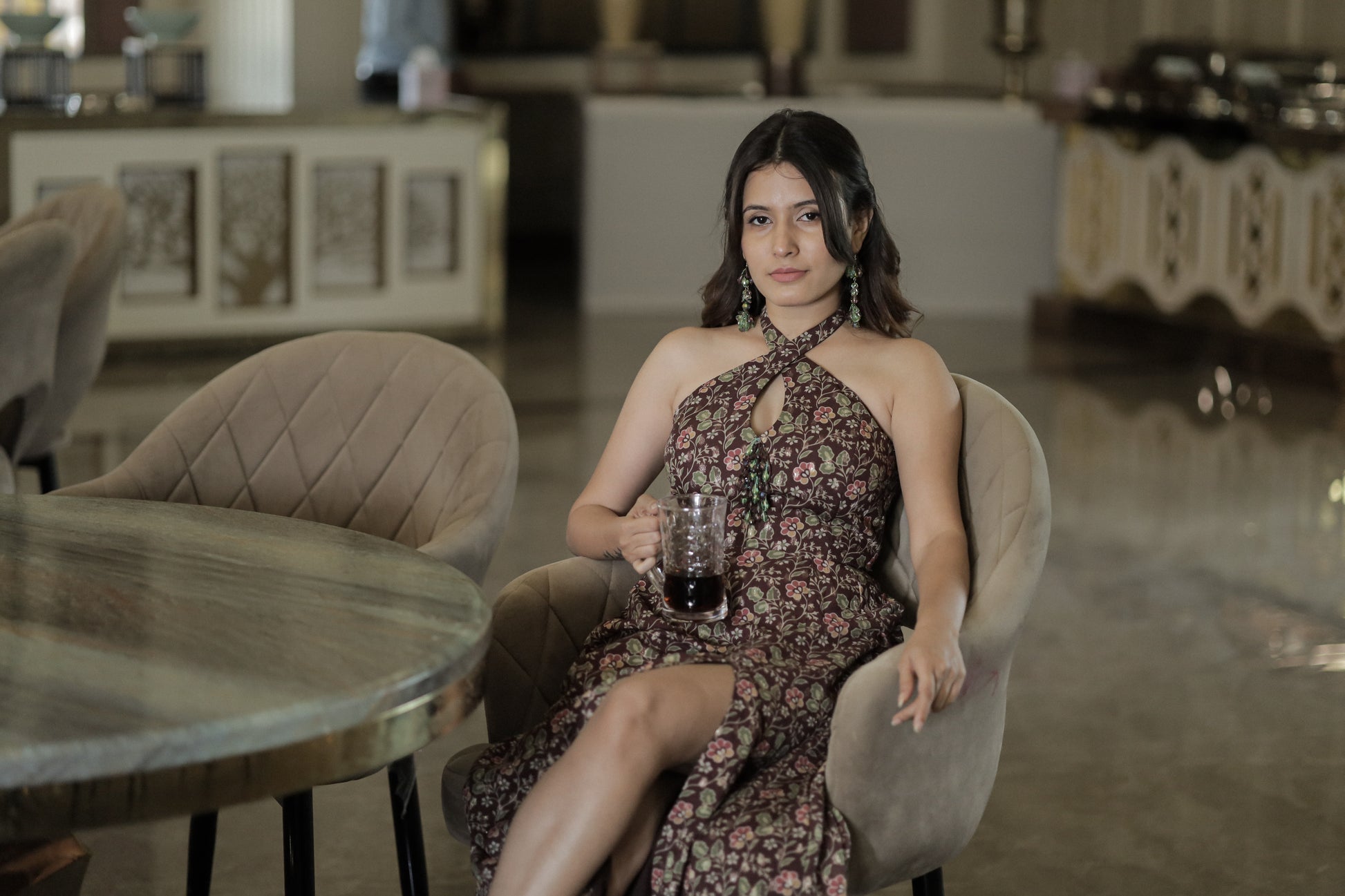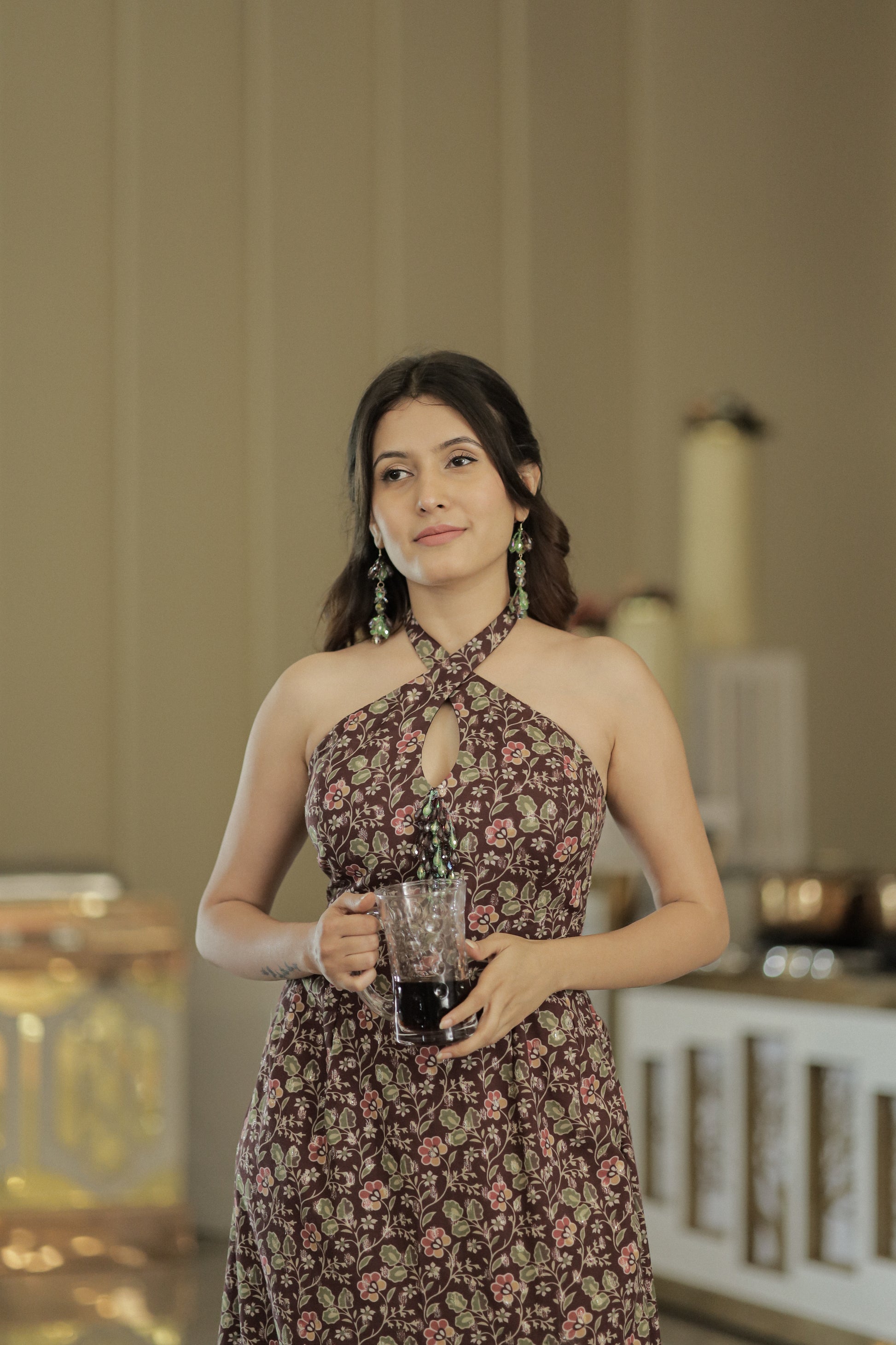 Cocktail Key hole halter neck backless gown. Little bead embroidery patch and matching earrings.
