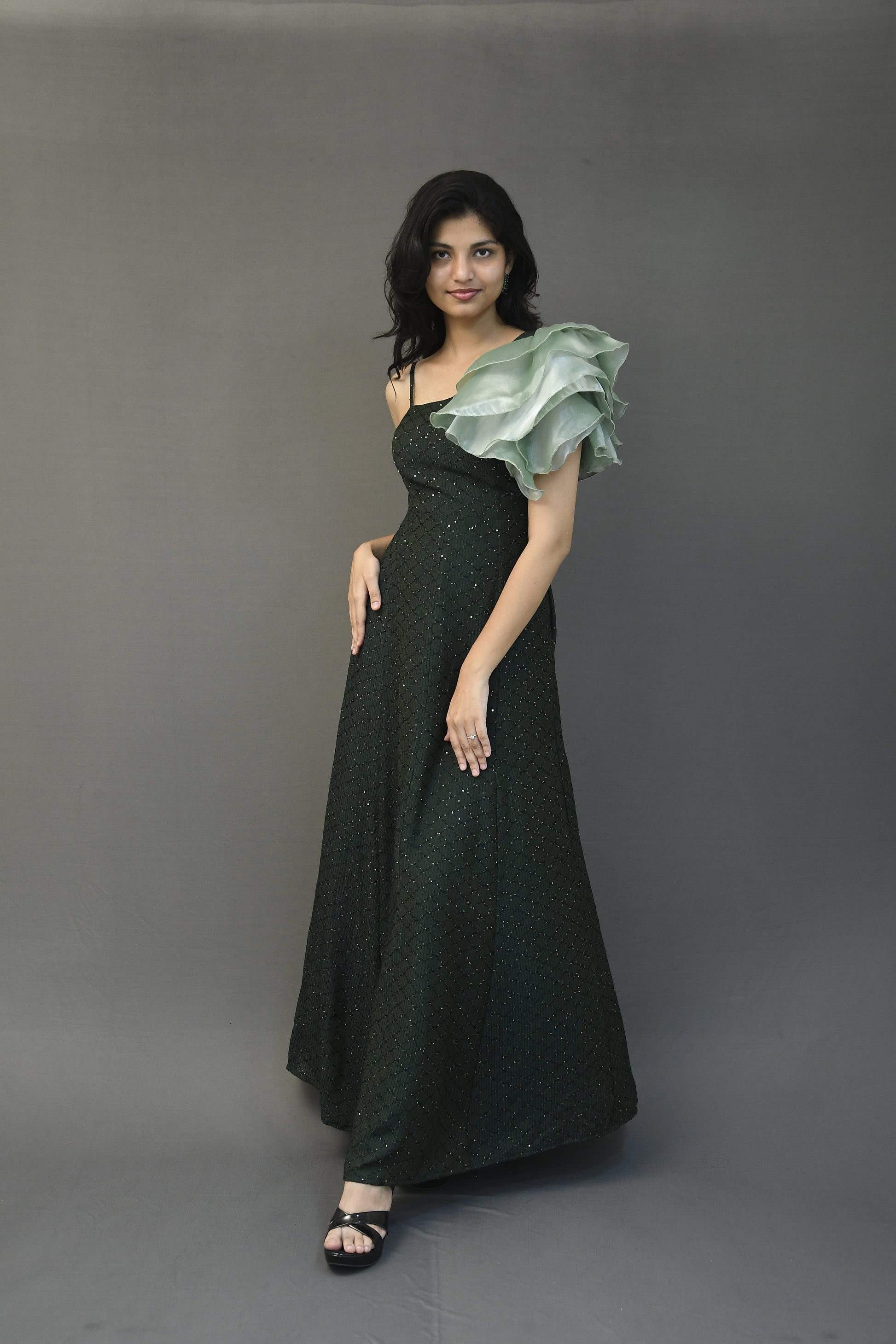 This dark green gown features asymmetric ruffles and adjustable belt with dip back.