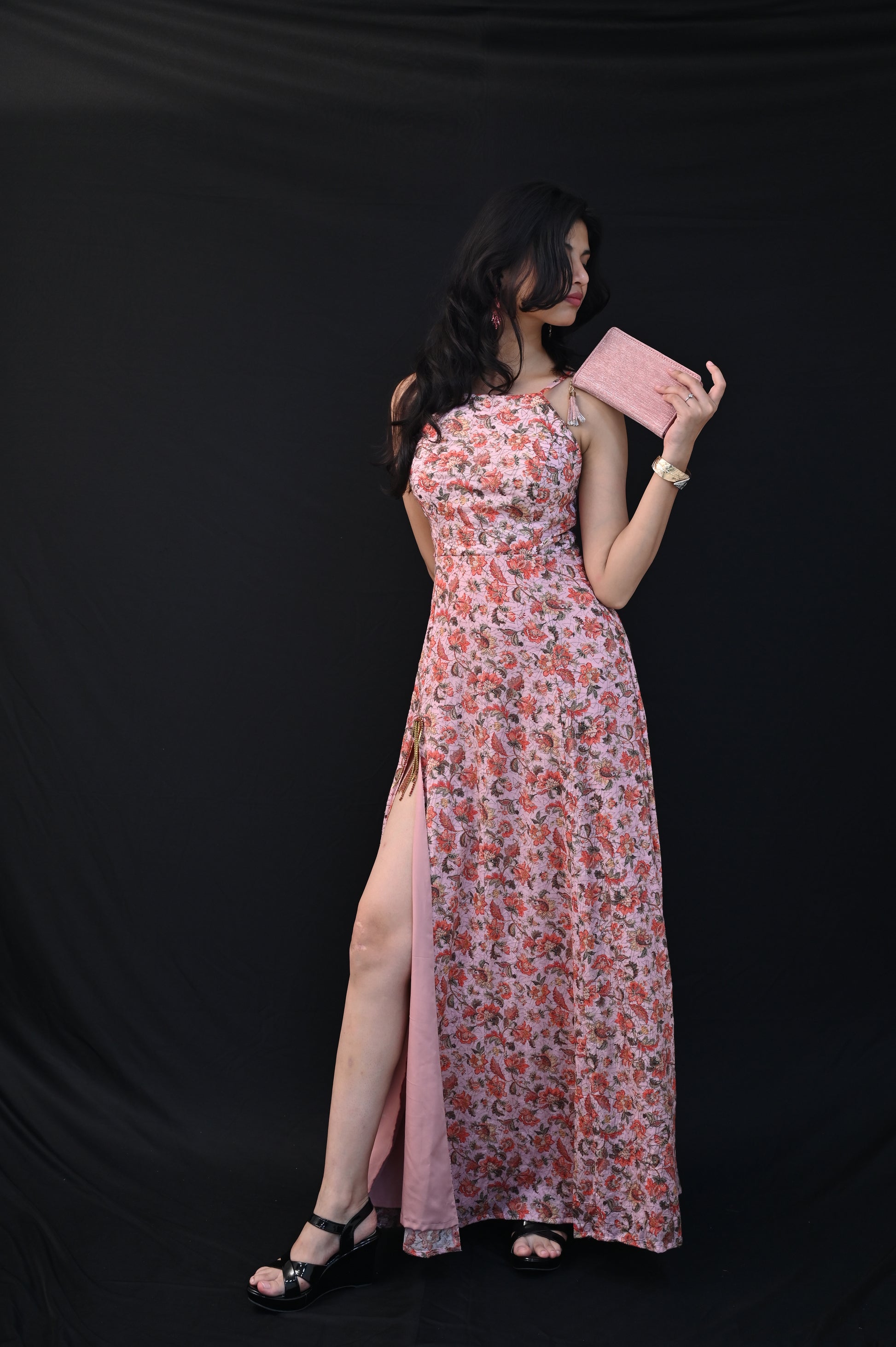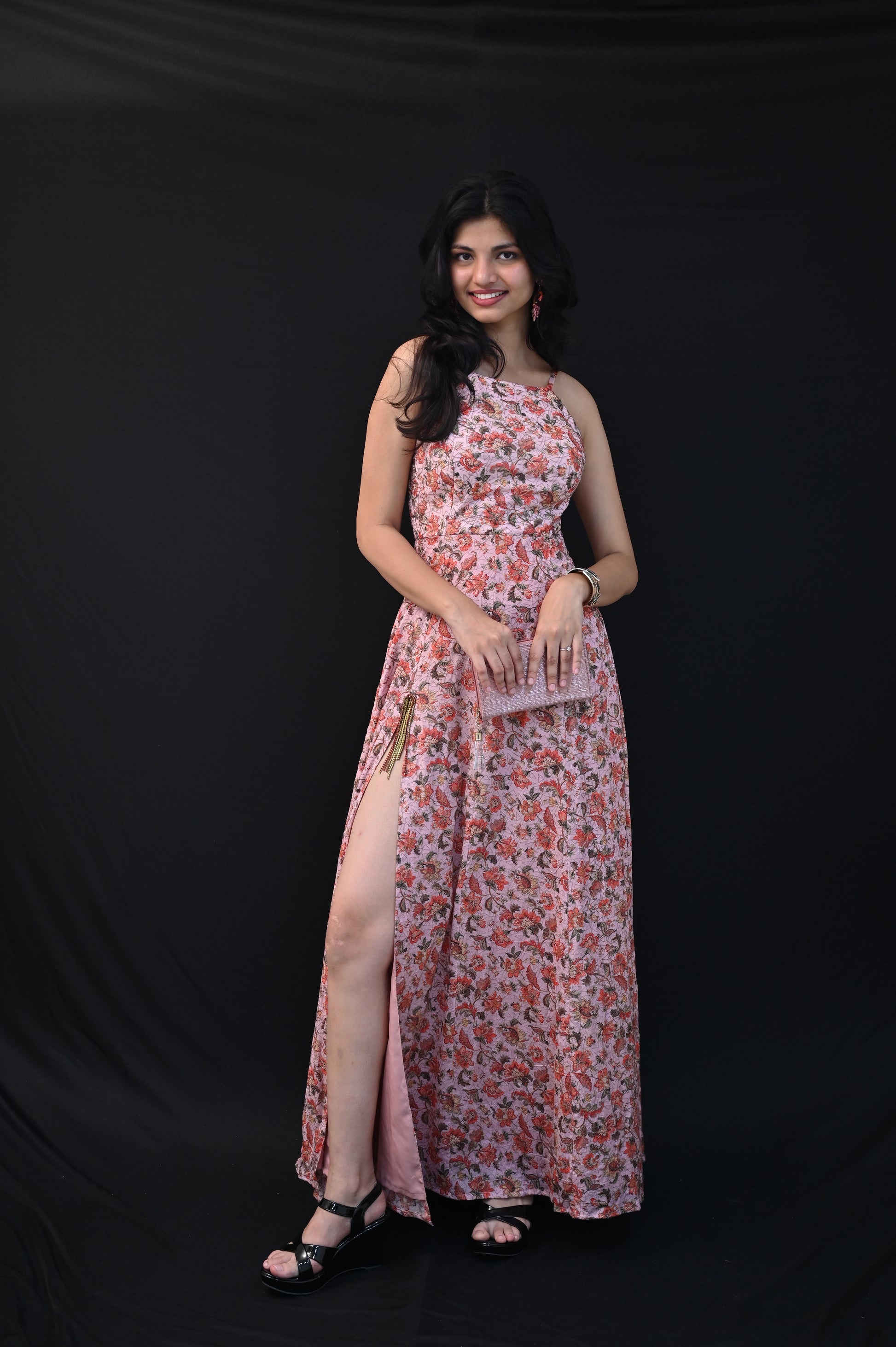 This floral pink gown features square neck line and dip back with adjustable belt and high slit.