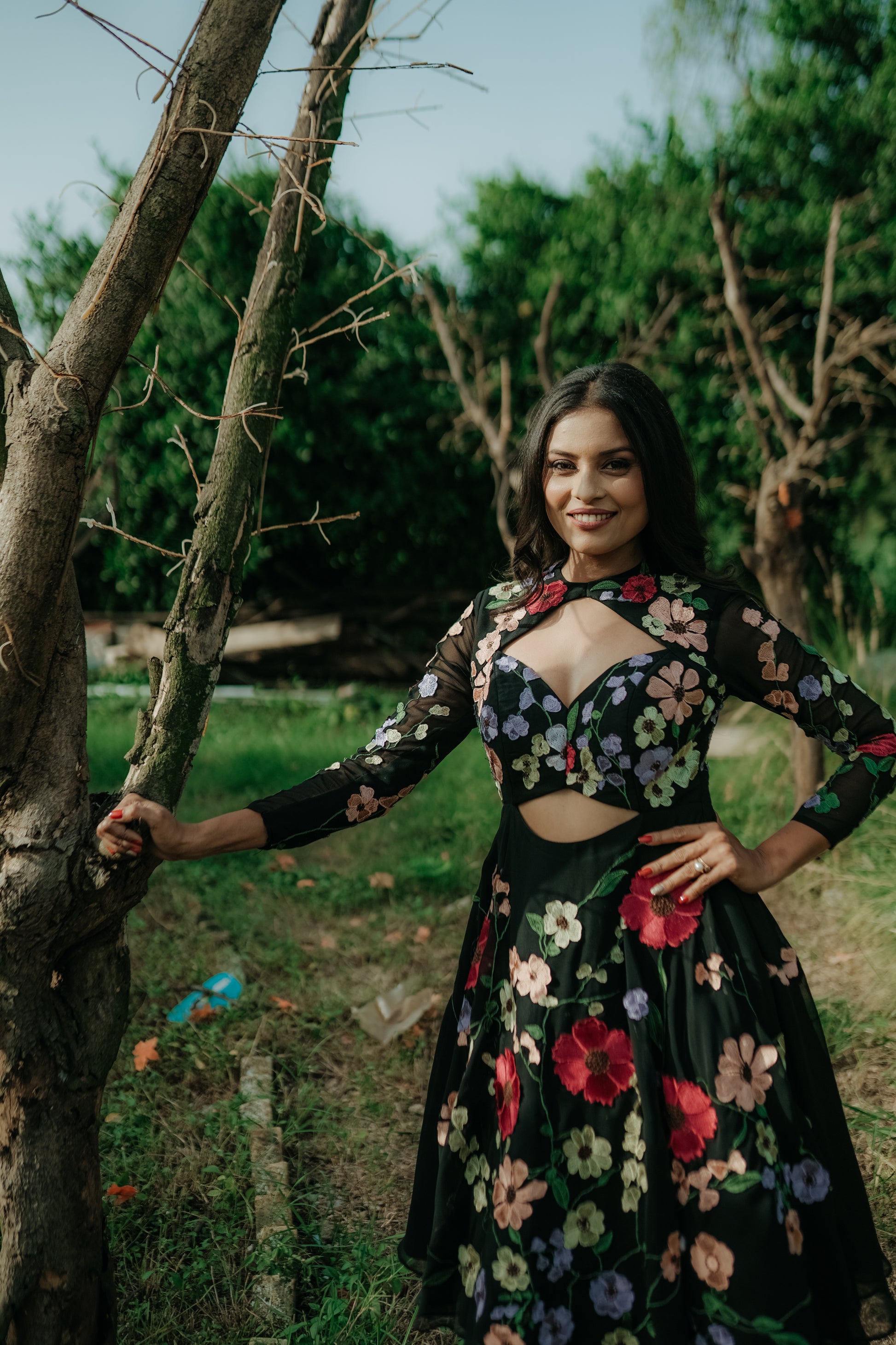 A romantic georgette creation featuring vibrant floral applique motifs, full sleeves, and a classic square neckline that blooms into a voluminous umbrella flare