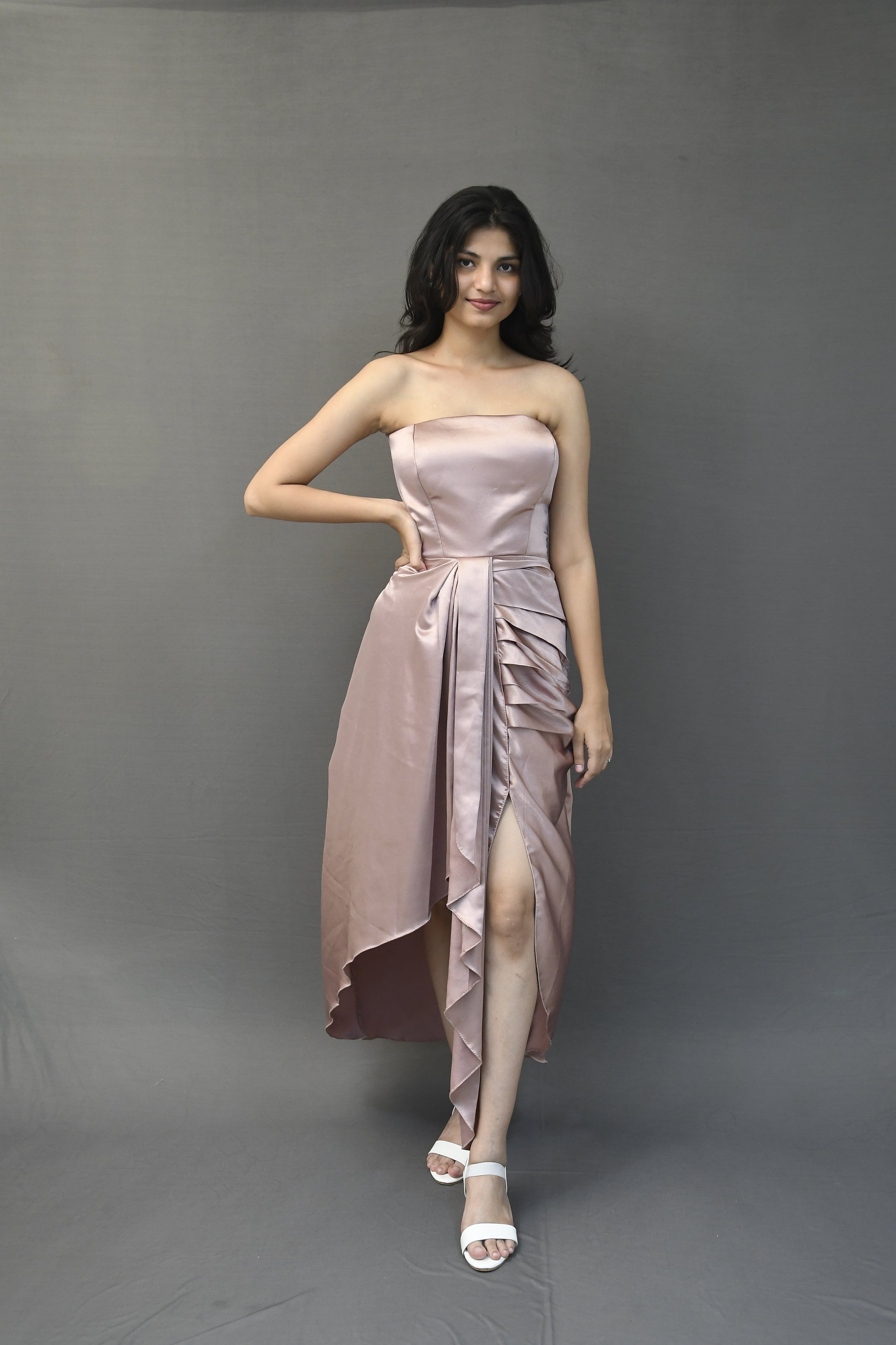 This rose-pink corset gown features asymmetric flare pattern. The top is a corset fit and origami on hips.
