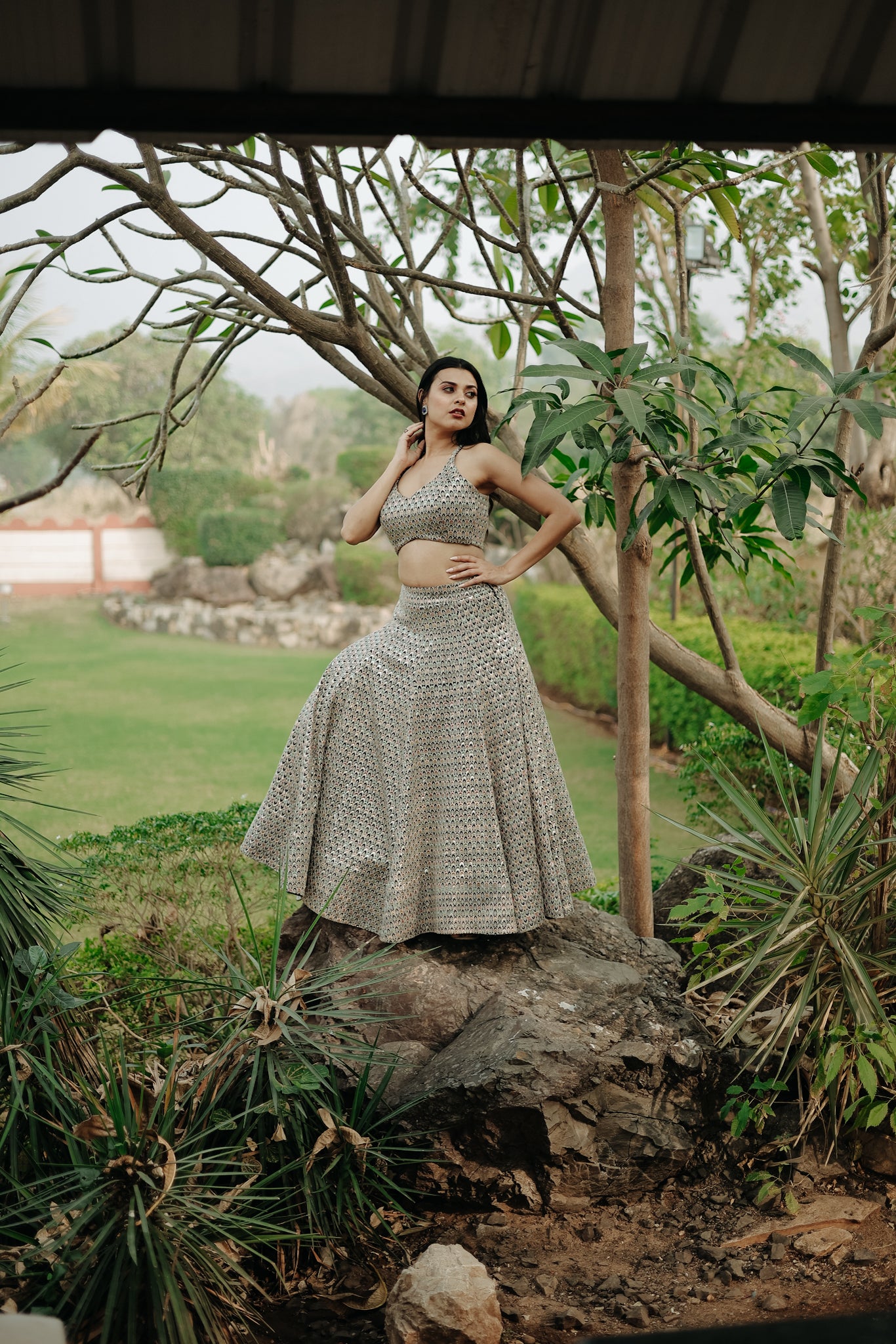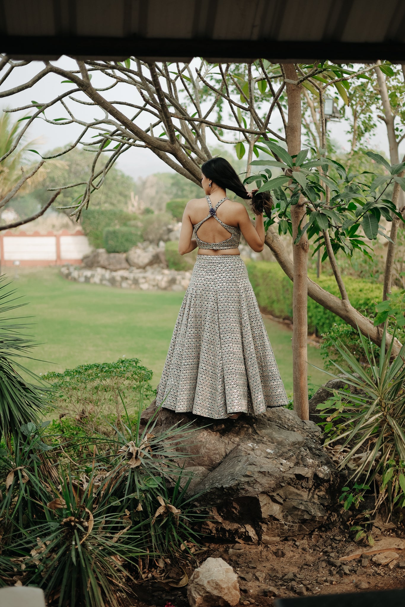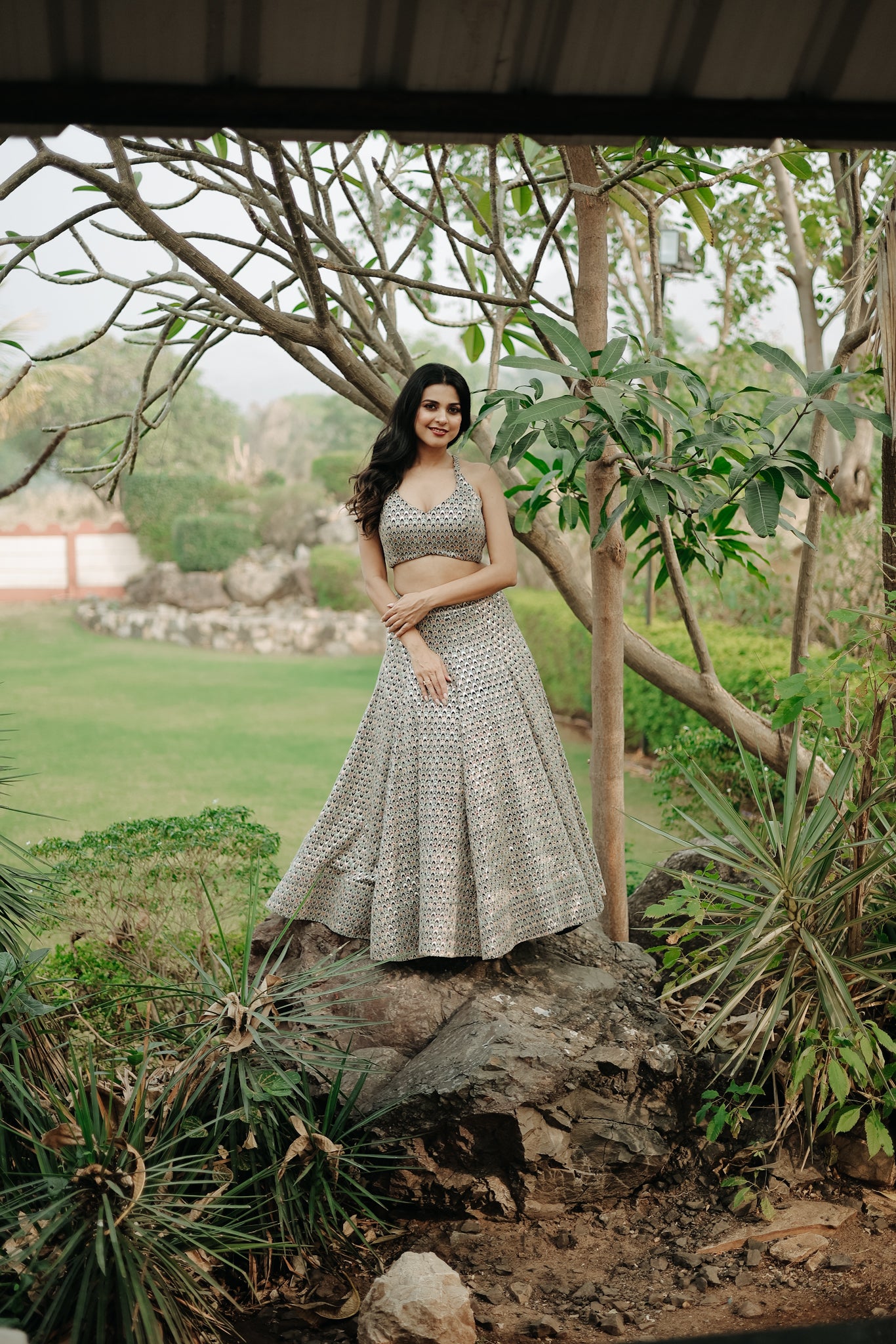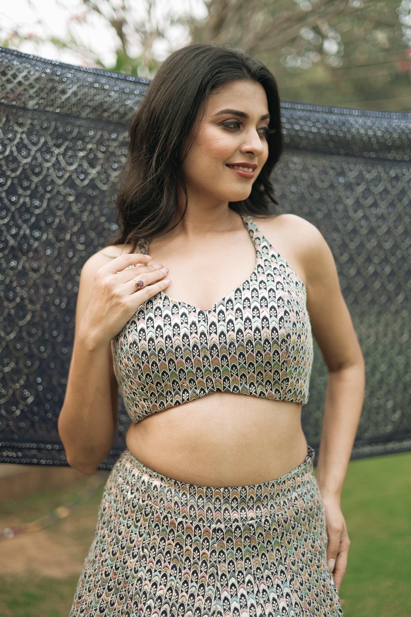 Navy georgette lehenga with foil embroidery, paired with a Bollywood-style Haulter blouse and a beaded-back twist — finished with a statement dupatta that dazzles.