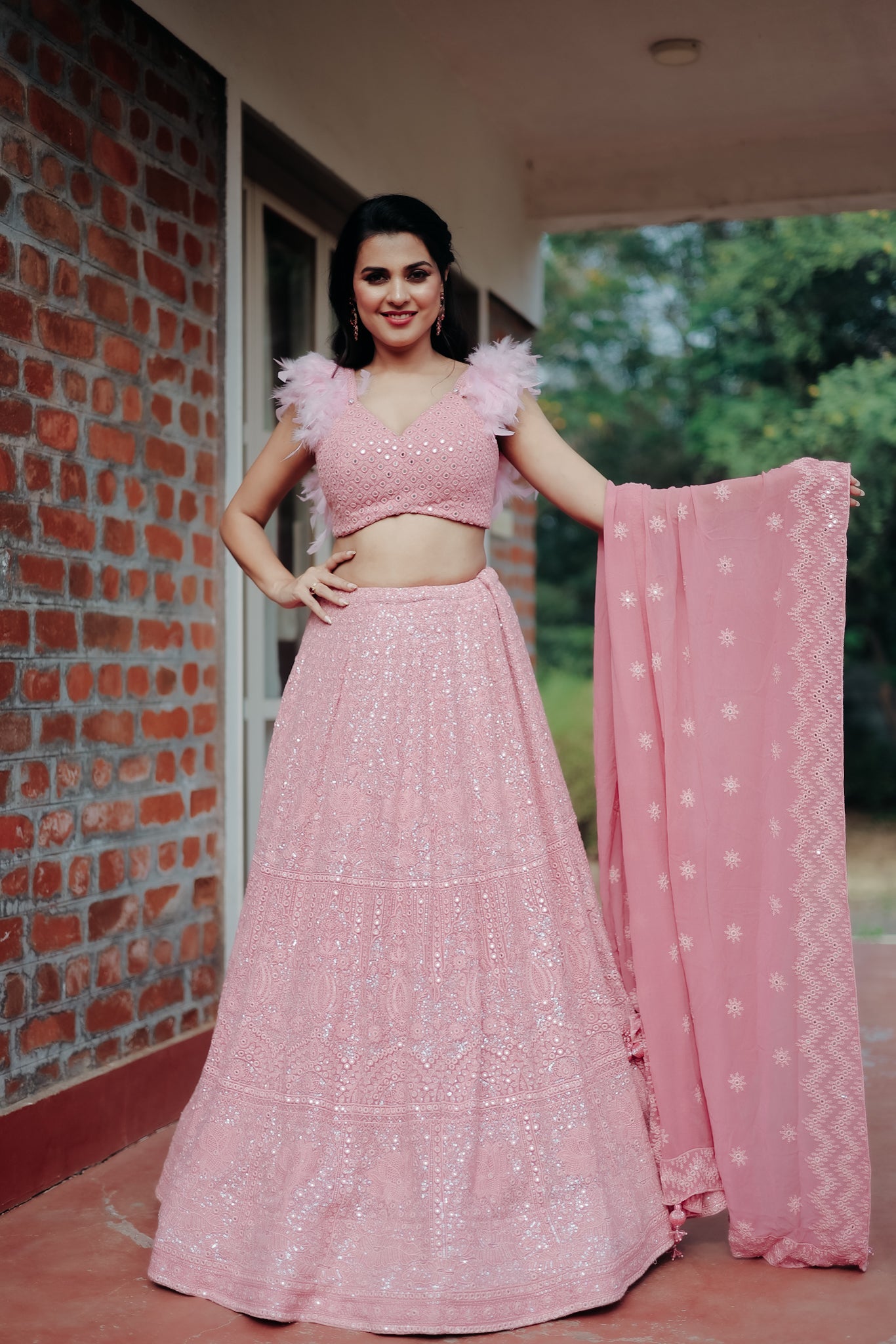 A flowy georgette skirt adorned with intricate thread embroidery, paired with a mirror-studded blouse featuring delicate feather detailing on the shoulders. The tassel-trimmed dupatta completes the look with effortless charm